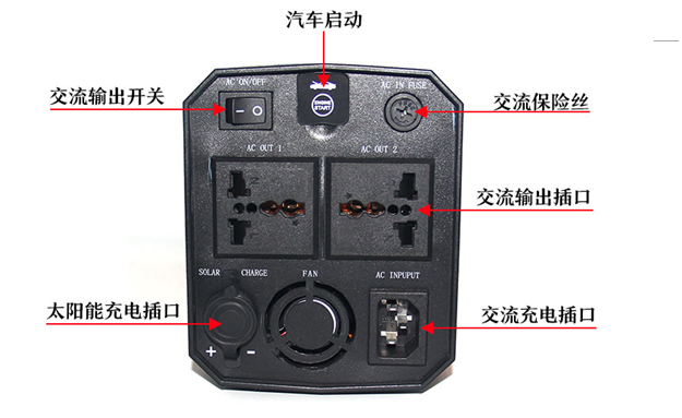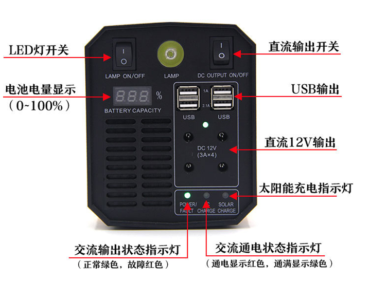 (2)本產(chǎn)品通過(guò)內(nèi)置電源轉(zhuǎn)換器把鋰電池和交流市電轉(zhuǎn)換成交流220V/50HZ 或110V/60HZ 500W 修正正弦波/純正弦波輸出;產(chǎn)品帶有4個(gè)USB充電口,輸出電流高達(dá)6A;帶有4個(gè)12V輸出口,輸出電流高達(dá)10A;帶有1個(gè)8字市電輸入口,可為本產(chǎn)品充電和為負(fù)載供電;帶有1個(gè)太陽(yáng)能充電輸入口,方便戶外時(shí)通過(guò)太陽(yáng)能或者汽車點(diǎn)煙器為本產(chǎn)品充電;還有2個(gè)多功能交流輸出口,可以接駁總功率500W以內(nèi)的交流負(fù)載;特別適用于移動(dòng)辦公、通訊、應(yīng)急設(shè)備的供電及充電;適合各品牌手機(jī)、電視機(jī)、節(jié)能燈、電風(fēng)扇、手電鉆、筆記本電腦、數(shù)碼電器類產(chǎn)品如:便攜式攝影機(jī),數(shù)碼像機(jī),DVD等。
